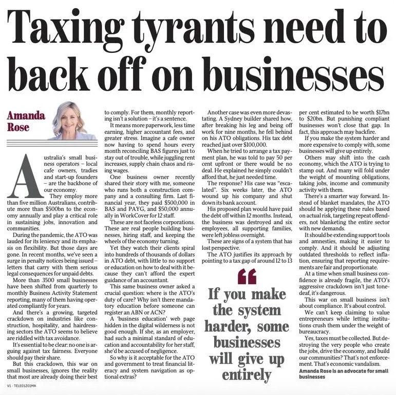 The Daily Telegraph – Taxing tyrants need to back off on businesses 21 July Written By ESBWA ESBWA Founder Amanda Rose highlights concerns around increased tax burdens and the widespread impact of ATO crackdowns on small businesses. Media ESBWA